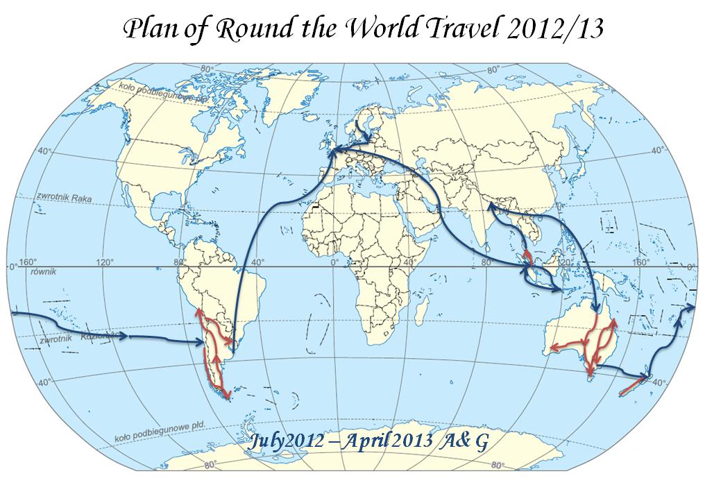 Po przelocie z Norwegii do Polski umownym punktem startowym Wyprawy będzie nasz rodzinny Gdańsk. W połowie lipca ruszamy do Londynu skąd rozpoczynamy Wielka Pętlę wokół Ziemskiego Globu. W stolicy Wielkiej Brytanii spędzimy 2 dni aby zaaklimatyzować się podróżniczo, będąc jeszcze na europejskim kontynencie.  Stamtąd mamy lot do Singapuru – państwa/miasta, które będzie stanowić swojego rodzaju „bazę wypadową” w rejonie Azji Pld.-wsch. W tej części Świata chcemy zwiedzić: Malezję, Tajlandię, Indonezję (razem z wyspą Bali), a także być może Chiny południowe oraz Nepal (i trekking w Himalajach). Po opuszczeniu Azji lecimy do Australii. Zaczynamy od północnej części tego kontynentu i miasta Darwin. Później drogą lądową przejedziemy przez środek tego pięknego kontynentu, odwiedzając miejsce kultu Aborygenów – Alice Springs. Następnie przejdziemy na południowe wybrzeże do Adelaide, Melbourne, Tasmanii i na zachód: Sydney, Brisbane, Cairns. Po Australii ruszamy w kierunku Nowej Zelandii gdzie chcemy zobaczyć jak najwięcej się da zarówno na obu głównych wyspach jak na okolicznych wyspach Pacyfiku. Potem w planach mamy Fidżi i wyspę Wielkanocną z ogromnymi i tajemniczymi posągami. Po Pacyfiku lądujemy w Ameryce Południowej. Będziemy podróżować po Patagonii, czyli Chile, Argentyna aż na sam południowy kraniec tego kontynentu. Później prawdopodobnie przyjdzie czas na Peru, Urugwaj i być może południową Brazylie. Ostatni długi lot będziemy mieli na trasie Buenos Aires-Londyn. W ten sposób w połowie kwietnia 2013r. po 9-ciu miesiącach podroży planujemy zamknąć trasę Podróży Dookoła Świata i powrócić po „nieco” przedłużonym urlopie do życia codziennego w Europie 🙂