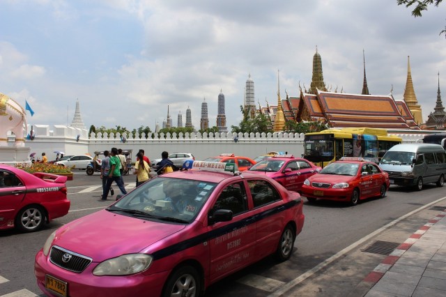 Miasto nie robi na nas dobrego wrażenia. Jest mnóstwo samochodów i szalonych kierowców. Trzeba bardzo uważać przechodząc nawet na pasach. Na początku ciężko złapać orientacje i często się gubimy. Dojazd do Grand Palace nie jest taki prosty, nie dojeżdża tam metro. Sprawdzamy wiec, jaki numer autobusu nam pasuje i wsiadamy, Okazuje się ze numer był poprawny ale są tez rożne kolory autobusów o tym samym numerze i my wsiedliśmy do złego koloru. Wysiadamy wiec na następnym przystanku i kompletnie nie wiemy gdzie jesteśmy. Poddajemy się łapiemy taksówkę i dojeżdżamy do Grand Palace. Okazuje się ze taksówka to nie jest taki zły pomysł w Bankoku. Jeden kurs kosztuje średnio 6-8zl pod warunkiem ze zmusi się kierowcę żeby włączył taxi-meter. Jeżeli nie chce włączyć to lepiej nie wsiadać i złapać następnego.