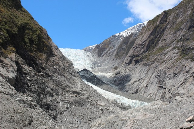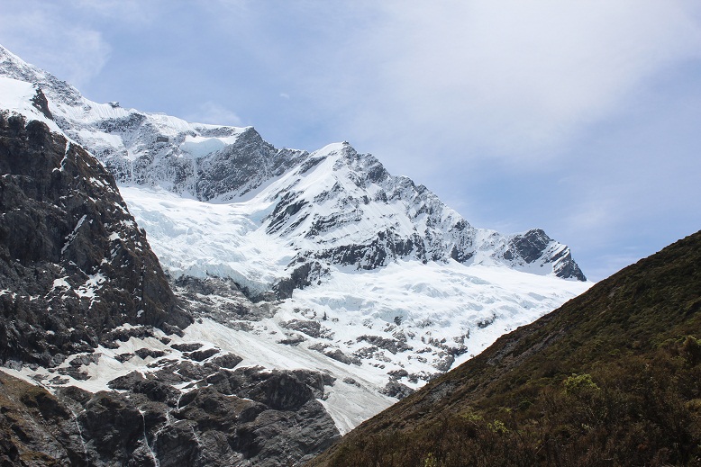 Dojeżdżamy do celu i idziemy razem na kilkugodzinną wędrówkę otoczeni majestatycznymi górami i lodowcami. Lodowce w tej dolinie robią na nas znacznie większe wrażenie niż rozreklamowane lodowce: Franz Josef i Fox, które widzieliśmy kilka dni wcześniej.