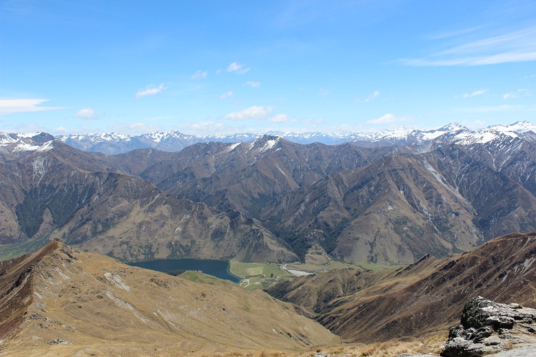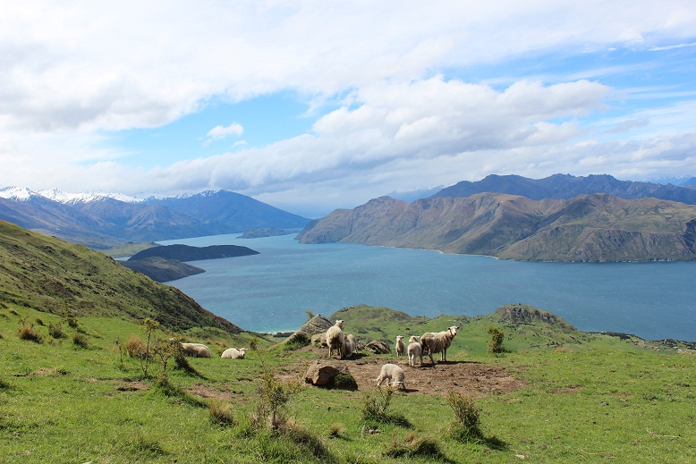 Dosyć strome podejście 1300 metrów zajmuje nam ok. 3 godz. Pogoda jest bardzo dobra a widoki zapierają dech w piersiach. Każda wysokość odsłania nowe horyzonty i różnorakie panoramy gór. Jezioro Wanaka u podnóży gór, przypomina nam trochę norweskie fiordy. Krajobrazy są jednak jeszcze piękniejsze od norweskich. Z jednej strony widzimy góry, które przypominają nam Karpaty ukraińskie, z drugiej podziwiamy Alpy, a z trzeciej fiordy wśród lasów tropikalnych. Znaczna część szlaku wiedzie przez klimatyczne zielone pastwiska z wielkimi stadami owiec. Nie mamy już wątpliwości ze jesteśmy w Nowej Zelandii. Tak właśnie wyobrażaliśmy sobie ten tajemniczy i odległy kraj mlekiem i miodem płynący.