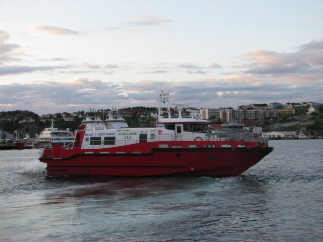 Nie tyle smieszne co ciekawe – karetka pogotowia w Kristiansund na wodzie. Miasto polozone jest na kilku wyspach i to droga morska mozna najszybciej dotrzec do potrzebujacych